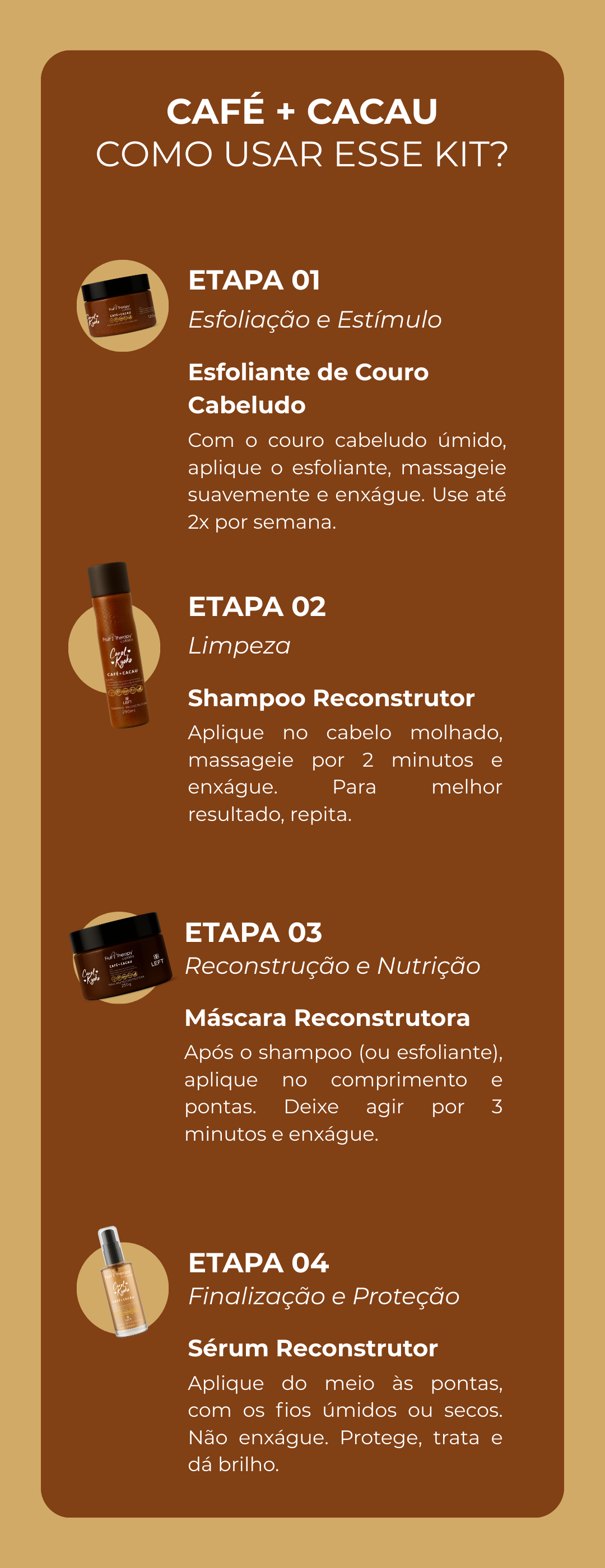 Shampoo Café + Cacau – Aplique nos cabelos molhados, massageie por 2 minutos e enxágue bem.