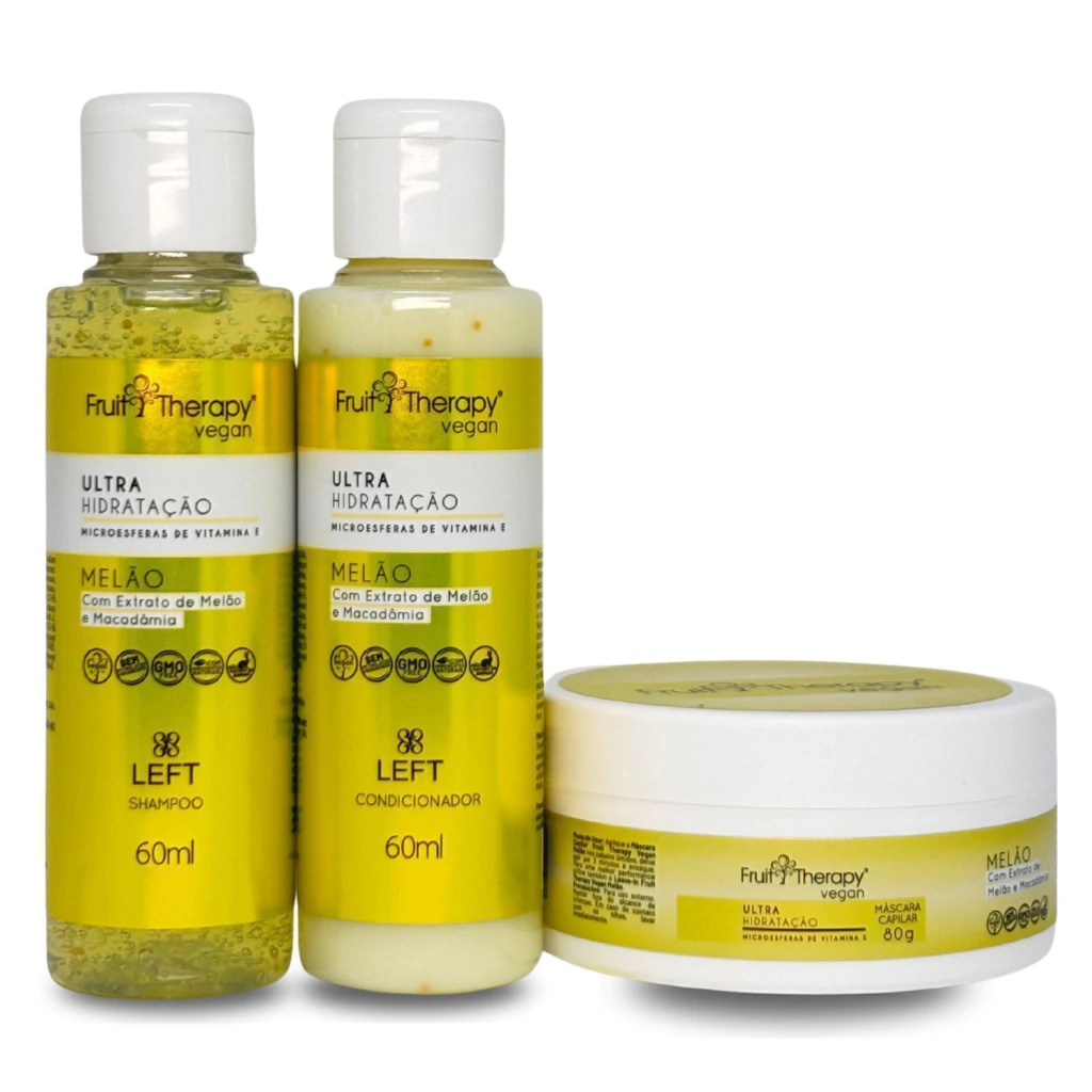 A linha mais refrescante e nutritiva da Left agora em tamanho prático para você testar ou levar na mala. O Kit Mini Ultra Hidratação Melão e Macadâmia foi desenvolvido especialmente para devolver a vitalidade aos fios secos ou ressecados, proporcionando hidratação intensa, brilho e leveza em cada aplicação. Sua fórmula exclusiva combina Extrato de Melão, que garante hidratação imediata e luminosidade, com Extrato de Macadâmia, poderoso emoliente que nutre e reduz pontas duplas. Além disso, conta com a Nano-Emulsão de Silicones, que condiciona a fibra capilar de dentro para fora e protege contra a ação solar. As microcápsulas de Vitamina E, presentes no shampoo, condicionador e máscara, liberam antioxidantes no momento da lavagem para cabelos ainda mais saudáveis.